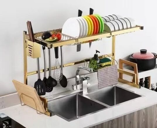 وداعاً للفوضى وضيق المساحة في المطبخ! احصلي على مطبخ مرتب وأنيق مع “حامل الأواني المتكامل”. تم تصميم هذا المنظم بذكاء لاستغلال المساحة الميتة فوق الحوض، مما يسمح للأواني بأن تجف مباشرة داخل المغطس دون تبلل سطح العمل.
